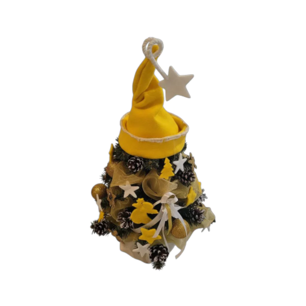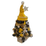 Tento elegantní mini stromeček v netradiční žluté barevné paletě je dokonalým doplňkem zimní a vánoční výzdoby. Kombinuje detailně zpracované umělé větvičky, zasněžené šišky, zlaté koule, bílé hvězdy a žluté výřezy. Celek doplňují jemné dekorační stuhy, které dodávají stromečku jemnost a eleganci.